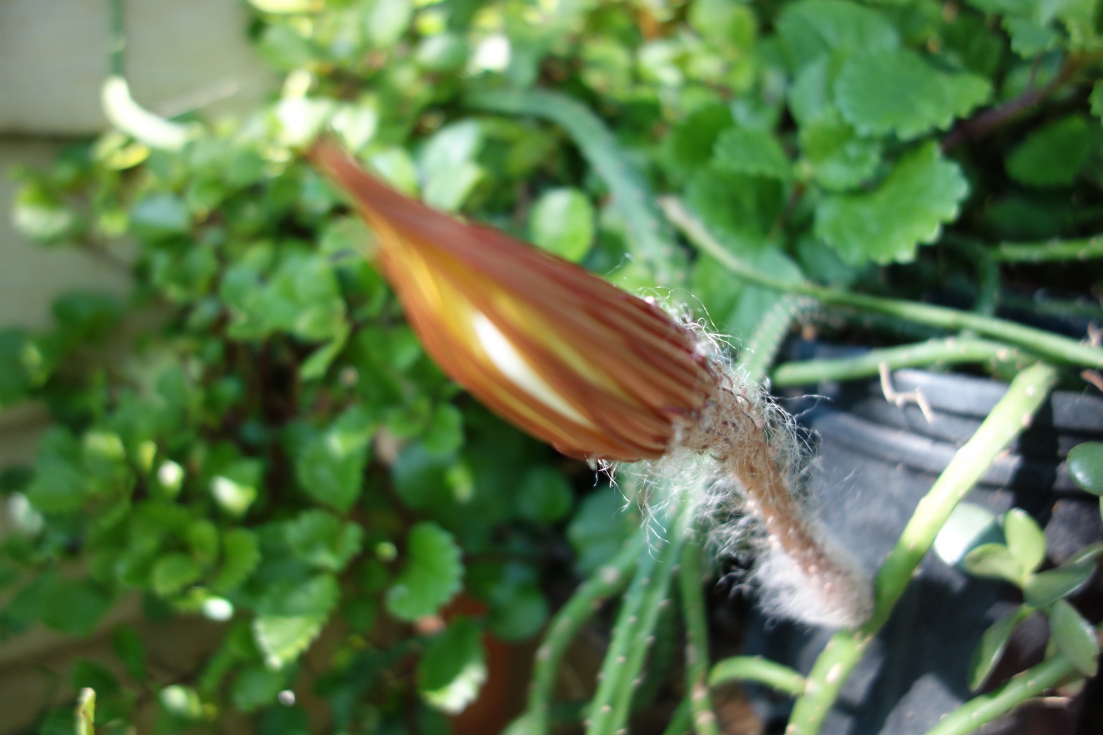 The flower bud pushes through the fuzz and elongates. To the immature mind, this can be a great source of silly laughter...:)