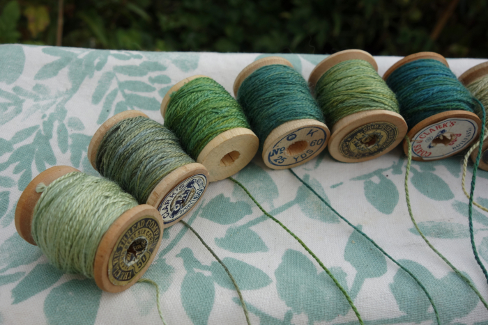 Green Silk Embroidery Threads Naturally Dyed on 12 Vintage Wooden Spools Green Silk Plant Dyed with Indigo and Flowers 10 Yards Each