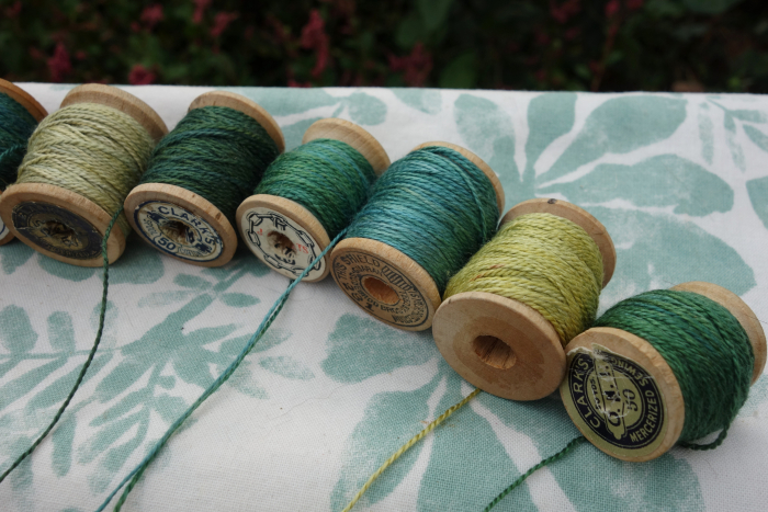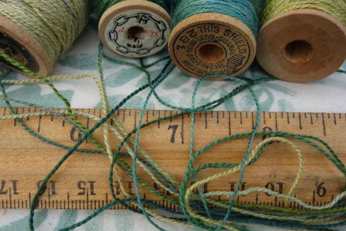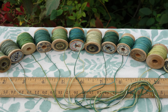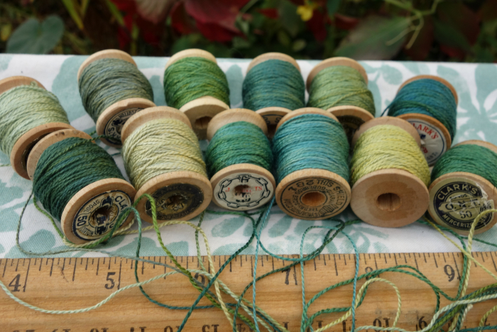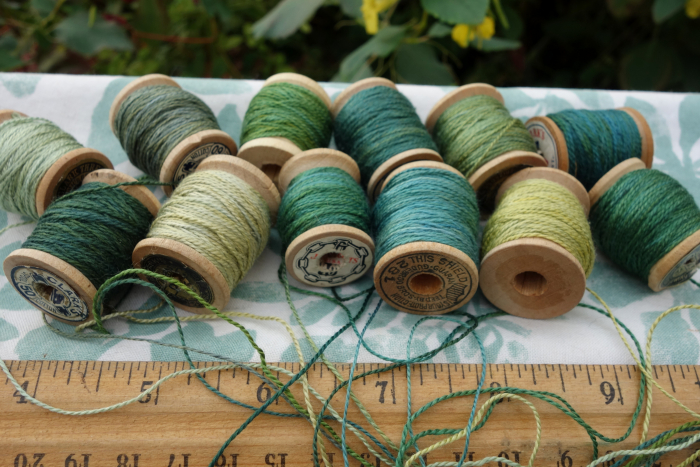 The threads were hand dyed and wound by me onto each vintage wooden spool.