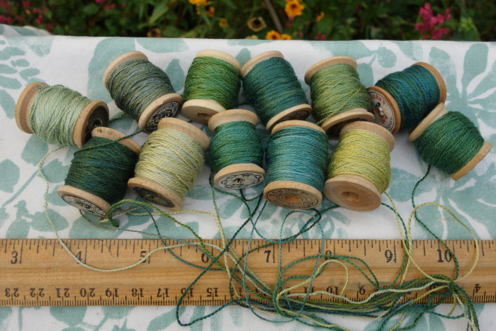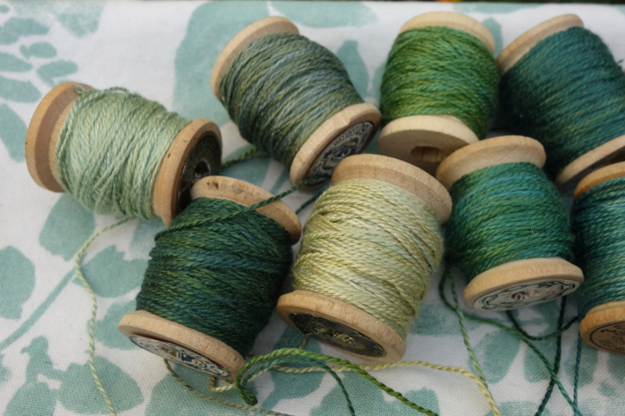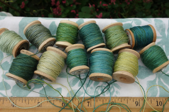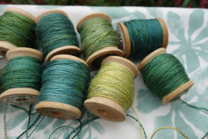 These green silk threads were hand dyed with indigo, marigolds, and coreopsis flowers.